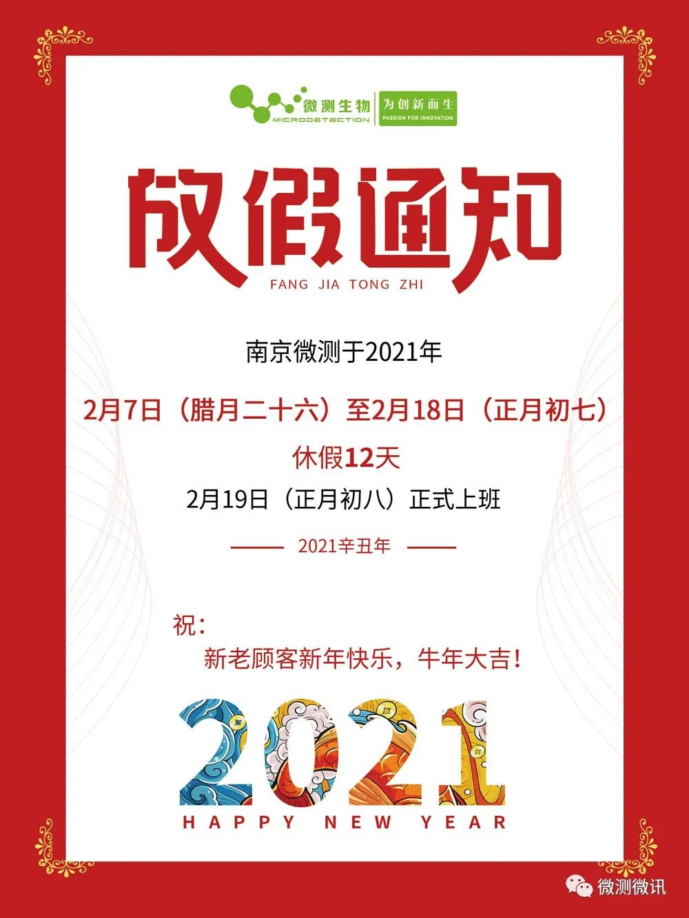 時(shí)光荏苒,歲月悠悠,轉(zhuǎn)眼間2020年已經(jīng)過去了,嶄新的2021年正向我們緩緩走來,南京微測(cè)根據(jù)國(guó)家規(guī)定,對(duì)2021年春節(jié)放假的時(shí)間安排如下: