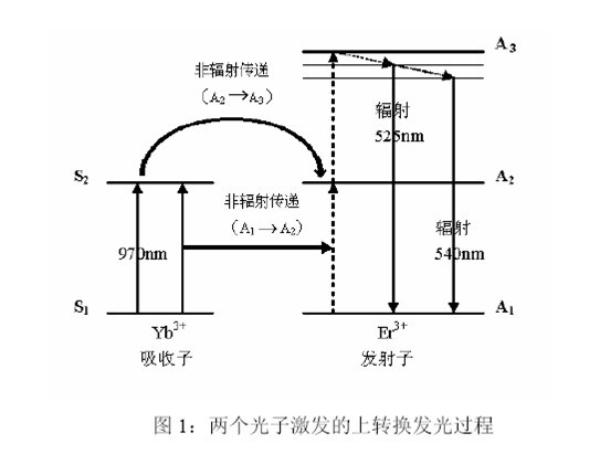 自然界中存在很多有機或無機物質,它們可以在電磁輻射激發(fā)下發(fā)射熒光或磷光,且在發(fā)光過程中遵守Stokes 規(guī)則,即發(fā)射光的波長長于激發(fā)光的波長。而在20 世紀70 年代,科學家們卻合成了一類可以反Stokes 規(guī)則產生磷光的特殊材料,即UCP。UCP 在紅外光區(qū)(波長>780nm)被激發(fā),卻可以發(fā)射波長遠短于激發(fā)光的可見光(波長475nm-670nm),即能量上轉換。物質構成決定性質特點。UCP 是由稀土金屬元素摻雜于晶體的晶格中構成的。在這種材料中有三種主要的成分:主基質(Host Matrix)、吸收子(Absorber)和發(fā)射子(Emitter)。作為主基質的晶體材料有:氧硫化物(如Y2O2S、GdO2S、La2O2S 等)、氟化物(如YF3、GdF3、LaF3 等)、鎵酸鹽(如YGaO3、Y3Ga5O12 等)以及硅酸鹽(如YSi2O5、YSi3O7 等)等;常用作吸收子的稀土金屬離子有:鐿離子(Yb3+)、鉺離子(Er3+)、釤離子(Sm3+)等;常用作發(fā)射子的稀土金屬離子有:鉺離子(Er3+)、鈥離子(Ho3+)、銩離子(Tm3+)、鋱離子(Tb3+)等。吸收子和發(fā)射子這一離子對在主基質晶格內適宜的空間取向和距離,是產生上轉換發(fā)光的基礎。上轉換發(fā)光的產生是一個涉及多個(至少兩個)光子的光學過程。在這個過程中(如圖1),UCP 內的吸收子(如Yb3+)至少要吸收兩個低能量光子(紅外光區(qū),如970nm),而后經過一系列內部能量轉換,以非輻射的形式(A1→A2,A2→A3)將這兩個光子的能量連續(xù)傳遞給發(fā)射子(如Er3+),以使其處于激發(fā)態(tài)(A3)。后者接著發(fā)生一個返回基態(tài)能級的躍遷,釋放一個高能光子(可見光區(qū),如525nm 或540nm),完成能量上轉換。