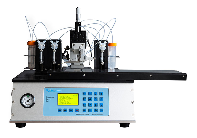 劃膜噴膜儀應用于側向層析試紙條領域,主要劃線,噴金,噴點三大功能,可將檢測線和質控線試劑噴涂到層析膜介質上(例如硝酸纖維素膜),同時也可以將標記物均勻,定量噴點到聚酯膜或玻璃纖維膜上的儀器,還可以在NC膜上噴點狀的抗原或抗體(多應用于干化學或滲漏法)。使用進口PEEK劃膜軟管將蛋白溶液印跡到層析膜表面,因使用的是軟管,柔韌性好,可有效降低劃痕對側向流動的標記復合物形成的阻力,避免假陽性的發(fā)生。其工作原理是依靠步進微量泵驅動,該儀器使用24000步的進口步進泵,出液精度控制在0.01ul,此劃線步驟無法用人工取代。